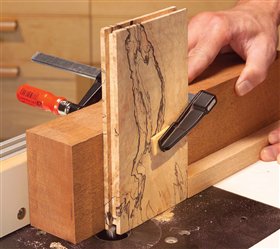 6 Rout grooves in the panel’s sides. Clamp the panel to a long, thick support board. This works better than a tall fence to prevent your precious piece from accidentally tipping in any direction.