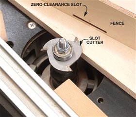 8 Set up your router table for cutting grooves in the frame pieces. Here’s the arrangement, taken apart. The grooves are cut with a 1/8-in. slot-cutting bit. The cutter sticks through a zero clearance slot in a 1/4-in. plywood fence. If your router table has a large opening around the bit, use plywood to cover the hole.