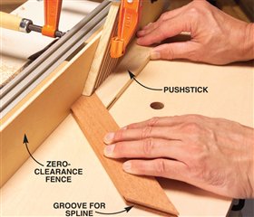 9 Rout grooves the full length of each miter. These grooves will hold a thin spline, which strengthens the joint and guarantees the frame pieces will glue up perfectly even with each other.