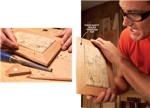 15. Glue the base together with an opposed-wedge jig. To apply clamping pressure, use carpenter’s shims—you’ll find them ready-made at hardware stores.