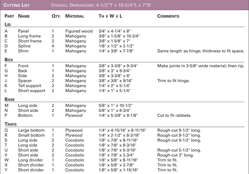 For the interior trays, you’ll need a little 1/4-in. plywood and some 1/8-in.-thick solid wood that looks elegant, such as rosewood. I chose cocobolo.