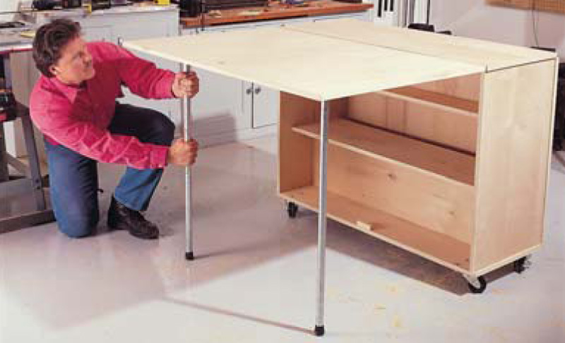 This simple, roll-around worktable fits in tight spaces yet expands to a huge work surface.