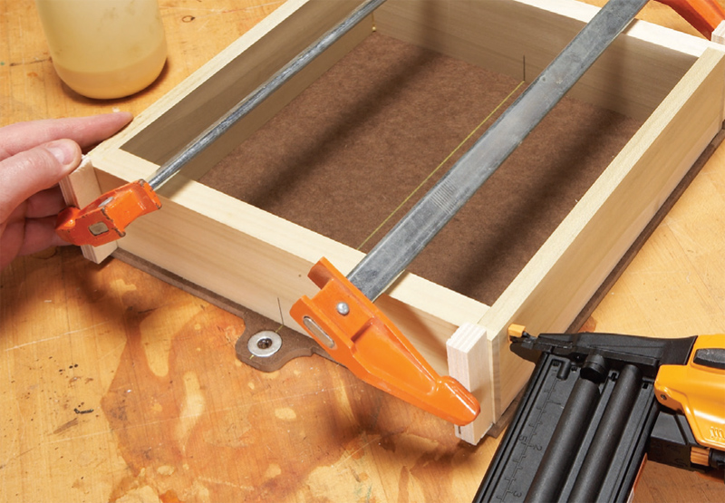 8. Glue the spreaders and the brace to the bench frame. Slide