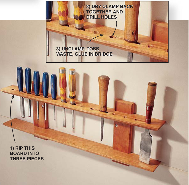 Make the rack by ripping three lengths of wood from one wide board. Cut the center piece 3⁄8-in. wide, then clamp them back together (without glue). Drill 5⁄8-in. dia. holes spaced 2-in. apart down the middle of the center piece. Unclamp the three pieces. Crosscut the center piece to make three short bridges, one from each end and one from the middle. Glue the wide board back together with the bridges separating the outer boards.