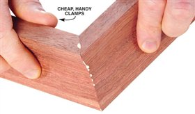 Long miters are a nightmare to clamp, but adding temporary triangular blocks makes it a snap. The key is to use paper from a grocery bag. Dab some wood glue on both sides of the paper, stick the blocks wherever you need them and let the glue set overnight. When you’re done clamping, remove each block with a hammer blow. The paper creates a weak spot in the glue bond, so the blocks break away without damage to the wood. Use hot water to soften any paper or glue left on the wood, then scrape it away and sand as usual. |