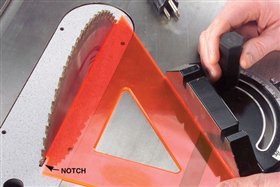 Drafting squares are inexpensive, accurate and great for tool or jig setup. Because they’re plastic, you can easily customize them to suit the job. We filed notches in this square to keep the saw teeth from interfering with setup. Drafting squares are available in various sizes for $4 to $10 at art and office supply stores. |