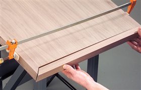 Mitered guides clamped in place let you perfect the length and angle of mitered edging. Use the edging stock itself to guide the fit of each piece. Clamp the guides precisely in place and work your way around the tabletop, gluing each perfected piece in place as you go. After you glue and clamp a section of banding, remove the adjoining guides immediately so you don’t accidentally glue them in place. |