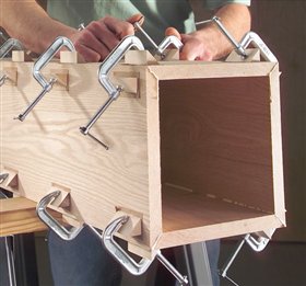 Getting all four corners of a box or frame aligned and clamped before the glue sets can be a frantic rush. Four notched blocks lower the frustration level by letting you tackle glue-up in manageable steps. Start by joining two corners to form the two halves of the box or frame. Allow those first two glue joints to cure for 30 minutes or so. Then rotate the notched blocks and complete the assembly by gluing the two halves together. |