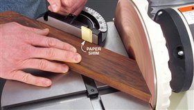 No tool can tweak a miter’s fit as easily as a disc sander can. You can shorten the workpiece a hair with a quick touch of the disc. You can also adjust the angle by a fraction of a degree. Instead of fussing with the miter gauge, make tiny adjustments by sticking a paper shim between the gauge and the workpiece. |