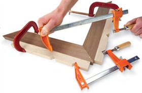 When you’re dealing with small or hard-to-clamp parts, the best clamping tools might be your hands. Simply apply glue to the parts; then rub them together to distribute and tack-set the glue. Hold the parts together on a flat surface for 30 to 60 seconds (although it may seem like 5 minutes). Watch the joint as you release pressure; if anything moves, squeeze and hold for a few more seconds. Let the assembly sit undisturbed for a half-hour before you handle it again. |