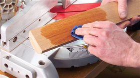 When you’re cutting miters on a miter saw, the spinning blade tends to push or pull the workpiece along the fence. A hold-down clamp will stop the creeping, but molded stock can be hard to clamp. In that case, dampen the back side of the wood. Moistened wood is less slippery and easier to hold in place. |