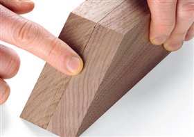 It takes more than a precision fit to make a miter joint look good; the wood’s grain and color should match, too. Using a single board to band a tabletop or build a picture frame makes color matching easier. Straight-grained boards are easier to match than those with wavy patterns. When matching wavy grain, try this: Miter one piece and then use it to find a matching area on the piece that will adjoin it. |