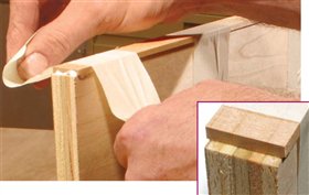 17. Assemble the case with biscuits in all the slots, and clamp to snug up the joint.Adjust the clamps so the case is square, and peel off the tape when the glue is rubbery.