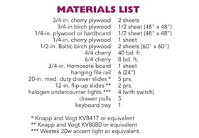 Tools and MaterialsThese cabinets are built using a plate joiner for almost all the case joints. You’ll find that it makes the pieces come together quickly and easily. Besides the plate joiner,you’ll need a tablesaw (with dado blade), a jointer and thickness planer, and a router table. A miter saw and tablesaw sled are handy, but not essential. A 35mm bit is useful for mounting the flip-up door hardware, but you could also use a 1-3/8-in. Forstner bit. We chose cherry for these cabinets, with drawers of Baltic birch. In our area, the materials for both the desk and two upper cabinets, including the hardware and lights, cost $1,100. You could also make the cabinets out of birch, which would bring the cost down to around $800.