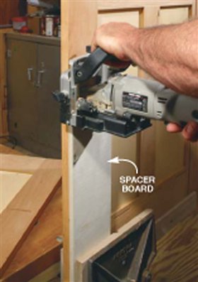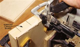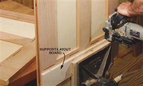 14. Cut biscuit slots in the cabinet bottoms, using the support/layout board to transfer the locations.