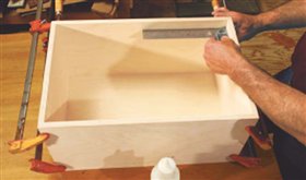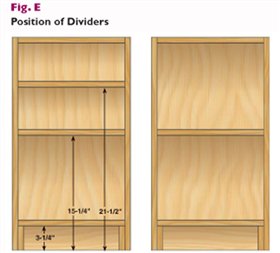 Start with the DrawersBegin with the drawers, because they have to be a precise width to hold the hanging files properly.You can then work outward from the drawers,making the cabinets fit the drawers perfectly. 1. Rip two sheets of Baltic birch plywood as shown in Fig. K, below. Crosscut the drawer parts (D1 through D5) from these pieces. Save the scrap pieces for testing your joinery setup later. 2. Cut the groove in the drawer sides (D2 and D5).We used the groove cutter from the adjustable tongue-and-groove set, in a router table.Use a featherboard and make test cuts to fine-tune the setup. Cut grooves in all the drawer parts, and don’t move the router table fence when you’re done. 3. Make a support/layout board for cutting the biscuit slots (Photo 1). Cut biscuit slots in the drawer sides first, then in the drawer fronts and backs.Use the support/layout board to lay out biscuit locations. 4. Measure the width of the drawer bottoms (D3).Dry-assemble one drawer and measure from the inside of one groove to the inside of the other.Subtract 1/16 in. for clearance (Photo 2). Trim the drawer bottoms to size if necessary. 5. Cut rabbets in the drawer bottoms, using the slot cutter in the router table. If the fence is in the same position, the width of the rabbet will be correct.Adjust the height of the cutter to produce the correct rabbet thickness. Dry-fit the drawers to test. 6. Assemble the drawers. First, sand all the drawer interiors.Then assemble the drawers (Photo 3),using #0 biscuits and white glue (for extra working time). Check drawers for square by measuring from corner to corner.