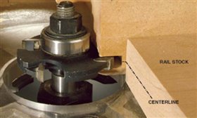 6. Set up a groove cutter on the router table, with the width of the groove equal to the thickness of your plywood, and the bit centered on your rail stock, and the bearing flush with the fence.