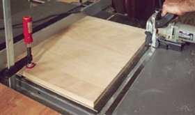 13. Cut biscuit slots in the desk sides, using a support/layout board as you did in making the drawers. Be sure to register your layout board from the front edge.