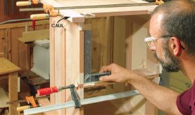 Assemble the Upper Cabinets38. First, it’s time to take care of a few odds and ends. Screw and glue the hanger cleat (U5) to the cabinet back (U4).Drill and countersink the holes in the top (U2) that will later be used for mounting the finished top (UT1). (Make sure you’re countersinking the inside surface.) Cut the four rails (U6), sand them,and glue two under the front edge of the bottom (U3), 1-in. back from the edge. Clamp the other rails to the back bottom edge of U3, and attach with screws.Then remove the screws and the rail. It’ll be easier to clamp the case without the rails there, and it’s hard to drill the holes after the case is assembled. Dry-assemble the case and mask-off around the biscuit joints. 39. Assemble the upper cabinets in stages.You’ll need about 28 #20 biscuits. First, glue and screw the top (U2) to the back (U4) and hanger cleat. Hold the assembly upright by using a 14-in. spacer under the top.Keep the ends flush, and use a square to check that the top and back are square.Glue,biscuit and clamp the bottom (U3) to the back (U4). Use the 14-in. spacer to help hold the assembly upright, and be sure the back and bottom are perpendicular (Photo 20). Allow this assembly to dry. 40. Glue and screw the rear rails (U6) in place. Glue and clamp the front rails in place, keeping the ends flush. 41. Glue, biscuit and clamp the end panels (U1 and frame-and-panel assemblies) to the partially complete assembly.Check for square, and remove the masking tape. 42. Install the doors.First, trim the doors so they fit the cabinets with an even 1/8- in. gap on both ends. Then install the hardware (Photo 21). For the slides we specify (see Sources, below), the included instructions are clear. (Other brands may have slightly different installation procedures.) Begin by drilling holes in the doors, centered 2 in. from the edge, to receive the cup hinges.Follow the hardware directions to determine the filler-strip dimensions, cut them, and install the slides.