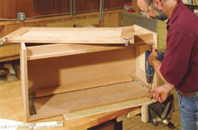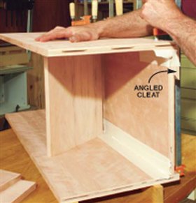 20. Assemble the upper cabinets in the same fashion as the lower units, with frame-and panel sides and banded plywood for the remainder of the case.An angled cleat built into the back makes installation much easier.