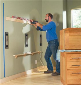 24. Install the cabinets by laying out two strips of masking tape that are perfectly plumb.Then measure up from the floor and in from the tape to locate the hanging strips for the upper cabinets, the mounting boards for the bulletin board, and the narrow shelf that holds the power strips.