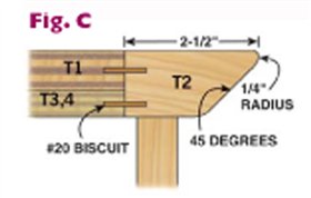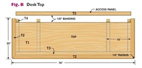 Build the Tops43. Rip your better sheet of cherry plywood to size for the tops (T1 and UT1). Rip strips of Baltic birch for buildup strips (T4,T3,UT2 and UT3) on the underside of the tops, and crosscut them to length. Note that the buildup strips for the desktop extend 2-in. beyond the top at the back and they hold up the loose access strip (T5).Also,you’ll have to piece together parts T3 and UT2 to get the necessary length.Glue cherry edge banding to all four sides of the access strip (T5) and the back edge of the top (T1). 44. Glue and screw the buildup strips to the underside of the plywood, long edge first. On the desktop, place two buildup strips 15 in. from each outside edge so they rest over the edges of the pedestals. For the upper cabinet top, there are buildup strips on either side of the centerline. 45. Mill the edge-molding stock, T2 (Photo 22). Saw and plane pieces of 6/4 cherry so they’re 5-1/2-in. wide and 1- 1/4-in. thick,or to match the thickness of your top. This piece will be ripped in half to produce your molding. Run the pieces through your planer to clean off the saw marks from the edges. Rout a 1/4-in. roundover on both top edges. Angle your tablesaw to 45 degrees, and rip the angled edges.Keep the wide side of the material, the side with rounded corners,resting on the saw top as you cut. Feed slowly, because you’ll be cutting with the show side down. Rip the molding to 2-9/16 in.,with the beveled side facing up.Then joint the sawn edges. Be especially careful and use push blocks,because these are narrow pieces. Sand off saw marks on the beveled surfaces after the molding is glued to the plywood. 46. Cut miters on the molding.For each top, cut the miters on the short end pieces first,but do not cut them to final length. Instead, keep them 1/4-in. long. (Notice that the short molding for the desktop is longer than the top,T1,Fig.B.) Now cut the long front molding piece. Try to get the end pieces and front piece from one length ofmolding to keep the grain continuous.Clamp the long front molding piece in position and use the short end pieces to test the miters.Adjust if necessary.Trim the short end pieces to final length. 47. Lay out and cut biscuit slots in the top and molding.Use the fence of your plate joiner and register it from the top edge of the plywood and the molding for all the slots. There are two biscuits at each location; one in the 3/4-in. plywood, one in the 1/2-in.plywood. 48. Glue and clamp the edging to the plywood.Attach the long edge first,using the end pieces to get the long edge precisely located. After the glue is dry, glue on the short edging (Photo 23), gluing the miter joint at the same time. When the glue is dry, flip the top over. Sand the beveled edge smooth, ease the corners and finish sand both the edging and the top.