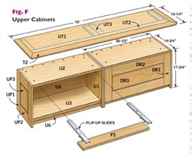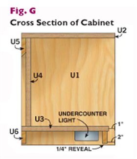 Cut Biscuit Slots in the Upper Cabinets33. Mark the ends of the upper cabinet for biscuits. There should be two web frames for the ends and two plywood parts (U1) that face each other between the two cabinets (Fig.F).Make sure you are laying out both lefts and rights. 34. Cut biscuit slots to join the back (U4) and the bottom (U3). Start by laying out slot locations in the bottom edge of the backs (U4).Center the slots 1-3/4 in., 9-3/4 in.and 17-1/2 in. in from each end.Use the hanger cleat (U5) as a spacer to rest the biscuit joiner fence on as you cut the slots. Set the fence to place the slot in the center of the plywood, and use the back face of the material as a reference.Cut mating biscuit slots in the back edge of the bottom (U3). 35. Cut biscuit slots to join the ends (U1 and frame-and-panel units) to the tops and bottoms (U2 and U3). Rip a support/layout board 2-1/4-in. wide, and crosscut it to the width of the bottom (U3).Lay out biscuit locations at 1-3/4 in. and 6-7/8 in. from each end.Using the support/layout board, cut biscuit slots on the inside face of the ends. Transfer layout lines to the ends of the bottom (U3), then cut those slots.Do the same for the tops (U2). 36. Cut biscuit slots to join the ends to the back (U4). Lay out the biscuit locations on the ends of the back (U4) where it will join the ends, 1-3/4 in. and 7 in. from the end.Cut the slots. 37. Dry-assemble the cabinets to make sure all biscuit slots are in the proper locations.