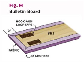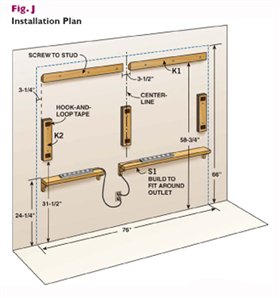 Install the Cabinets51. Locate a space on your wall that’s 76-in. wide by 67-in. high. Indicate the vertical boundaries of this space with masking tape. Keep the tape plumb (Photo 24 and Fig. J). 52. Attach the mounting cleats (K1) for the upper cabinet, screwing them into studs. Use a 4-ft. or longer level to be sure they are level and the upper edges are perfectly parallel. Hang the upper cabinets, and see how they fit together. We had to remove one and put a thin shim on one cleat to get the cabinets to come together tightly. When you’re satisfied with the fit, clamp the cabinets together, and drive a couple screws through the back of each cabinet into the mounting cleats.Clamp on the top,screw it in place, then reinstall the flip-up door slides and the doors.Adjust the doors if necessary. 53. Build small shelves (S1) to hold a pair of power strips. The exact length and position of these shelves will depend on the location of an outlet, but they should be mounted at the height and distances from the masking tape shown in Fig. J. Install the halogen lights on the upper cabinets, and the light switch wherever it is most convenient. 54.Assemble the desk pedestals and the kneehole panel a couple feet away from the wall.Attach the top to the pedestals, reinstall the drawers and drawer fronts, and attach the drawer pulls. Screw on a commercial keyboard tray to the underside of the top. Slide the desk up to the wall. 55. Make the bulletin board (BB1) and the mounting strips (K2).Measure the space between the desk and the upper cabinets, and adjust the width of the bulletin board if necessary; the tighter the fit the less the cords will show. The fabric can be just about anything, but if it has some stretch it will be easier to work with.Staple and glue it to the back of the acoustic panel. Glue and staple pieces of hook-and-loop tape to the panel and the mounting boards.Attach the bulletin board so it covers the light cords, and you’re ready to move in! |