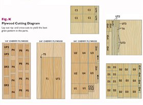 Cut and Edge-Band the PlywoodNow is a good time to cut and edge the 3/4-in.-plywood parts.Notice that two of the desk parts (C1 and C2) are of birch for the sake of economy, because only the front edge shows, and that is edged with cherry.The other parts are cut from cherry plywood. Choose the better of your two cherry sheets for the desktop (T1). The general approach we suggest for making the plywood parts is to rip the plywood to width,but only roughly cut them to length. Glue on the edge banding,sand it flush,and cut the pieces to length (Photo 4). This ensures that the banding is cut cleanly at the ends. 7. Rip the birch plywood as shown in Fig. K,to the widths required for the desk top and bottom (C1) and the dividers (C2). 8. Rip the less-good sheet of cherry plywood into four strips, as shown in Fig.K, to give you material for parts U2, U3 and U4.Save the remainder for other parts.Cut a 36-in.-long piece from each strip to make them easier to handle. 9. Prepare the 1/8-in.edge banding.You’ll need around 45 ft.of it,but make plenty, because it’s a drag to run out.Plane your cherry to the thickness of your plywood plus 1/16 in. Rip 3/16-in.-thick strips, then plane these to 1/8 in. 10. Glue edge banding to the plywood (Photo 4). Because these pieces will be trimmed later,you can leave the banding slightly short of the ends of the plywood. Note that parts U4 require no edge banding, and parts U1 require banding on two adjacent edges. Mark the U1 parts so you can orient them with the good side facing the inside of the cabinet (Fig. E).When the glue is dry, sand all banding flush with the plywood and crosscut all the parts to final length.