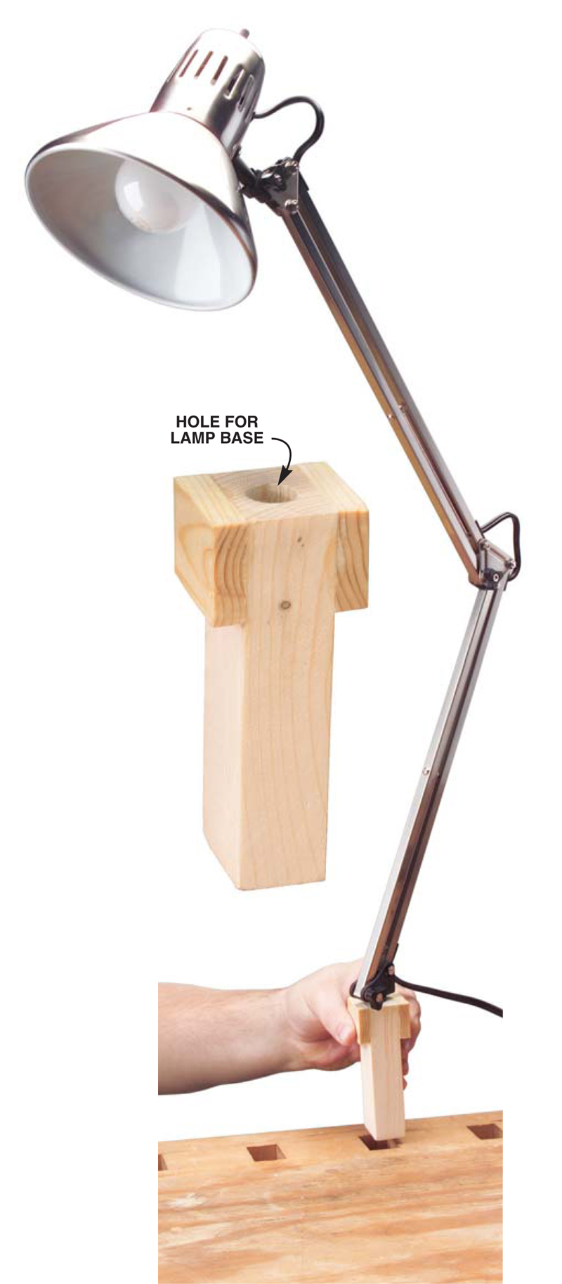 With this shop-made bench dog I can put light right where I need it. The dog is just a square chunk of wood with two smaller pieces glued to the sides. The smaller pieces act as stops. I used my drill press to drill the hole to a diameter that matched the base of my desk lamp.