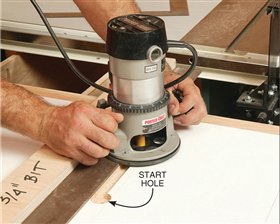 Make the tabletops11. Screw a continuous hinge to the riser (Photo 6). Set it lower than the riser by the thickness of the melamine top. A self-centering drill bit (also known as a Vix bit) makes this job much easier (see ?Source, below). 12. Cut the tops (H and J). Edge them with narrow bands (K, L and N) and wider rails (P and Q). Drill the hand holds in the folding table (see Fig. A, below). 13. Make the leg stops (R) by gluing two 3/4-in x 2-1/2-in. pieces together. Cut the leg stop end at 10 degrees. Glue and screw the leg stops to the folding table. Rout all the table’s edges and corners with a 1/4-in. round-over bit. 14. Drill the pivot bolt holes in the rail of the folding table. Bolt the legs to the folding table and hinge the folding table to the riser (Photo 7). Level the folding table to the saw table by adjusting the length of the legs. 15. Use a straightedge to extend both edges of the miter gauge slots onto the folding table. Rout 1-1/4-in.-wide miter-gauge slots in both tabletops (Photo 8). They’re extra wide so your miter gauge won’t bind. 16. Cut a continuous hinge into three pieces to fit the inner table and screw the pieces in place (Photo 9). Remove the hinges from the inner table and re-attach them to the inside edge of the riser. Keep the top of the hinge even with the top of the riser. Re-attach the inner table to the continuous hinge. 17. Position the inner table parallel to the saw and against the back of the splitter. Clamp the inner table in place and mark the splitter clearance slot (Photo 10). Locate the slot 3/4 in. to the right of the splitter on a left-tilt saw and 3/4 in. to the left of the splitter on a right-tilt saw. Tilt the blade to 45 degrees and mark the other side of the clearance slot 3/4 in. from the splitter. 18. Cut the splitter clearance slot with a jigsaw. Round over the edges. 19. Cut the inner table supports (G). Mark for T-nuts through the slots in D and install them. Level the inner table by adjusting the supports up or down. 20. If needed, sand a relief for the motor in the bottom of the inner table (Photo 11).