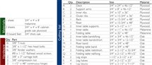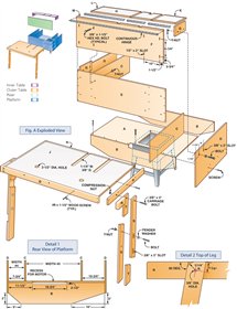 Measure your saw first, then cutOur plans will fit many contractor’s saws, but you may have to modify them to fit your machine. 1. Measure Height #1 on the saw’s box from the lowest hanging point, like the fence rails. If it is less than 11 in., reduce the width of the inner and outer ribs (C and D) by the difference. 2. If the Depth is more than 34 in., increase the length of C and D by the difference and enlarge the inner table. 3. If Width #1 is greater than 22 in., increase the width of the deck (A) by the difference. 4. If Height #2 is less than 34 in., reduce the length of the folding table (J) by the difference. 5. Measure the Offset for use in Step 6. 6. To position the left inner rib (C), measure the Offset and subtract 2-3/4 in. This gives you the distance between ribs C and D (Width #4, see Fig. A, Detail 1, below). Use Width #2 to locate the right inner rib (C) to ensure that it doesn’t interfere with the blade-tilt handwheel. If Width #2 is more than 22 in., add 5 in. to it. This new measurement (Width #5, Fig. A, Detail 1) is the distance between the left and right inner ribs. 7. If the handwheel is on the left side of the saw, measure Width #3. Add 3-3/4 in. for hand clearance and plywood thickness, and deduct this from the Offset. This is the distance (Width #4) between the left inner rib (C) and left outer rib (D). To locate the right inner rib, measure Width #2 and add 5 in. This is the distance (Width #5) between the two inner ribs. Cutting ListFig. A: Exploded ViewSource(Note: Product availability and costs are subject to change since original publication date.) Woodworkers’ Supply, woodworker.com, 800-645-9292, This story originally appeared in American Woodworker May 2004, issue #107. |