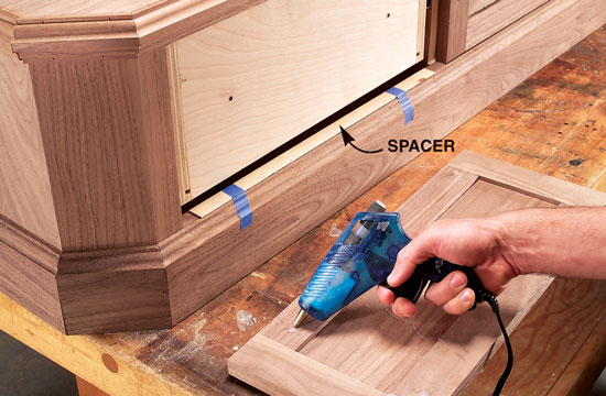 4. Temporarily attach the drawer front with a few dabs of hot-melt glue. Open the drawer and drive in the screws that will permanently hold the front. When you’re ready for finishing, remove the front and scrape off the hot glue.