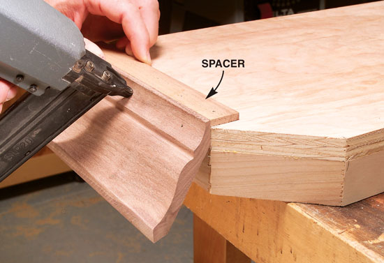 10. Attach the crown molding to the mounting board with a brad nailer. Use a spacer to create a lip on the bottom side. This lip will overhang the top edge of the bookcase units and hide the joint.