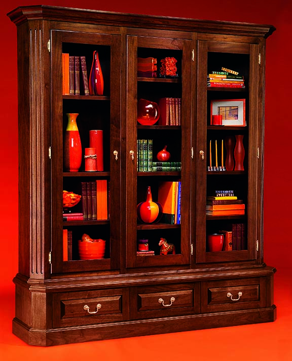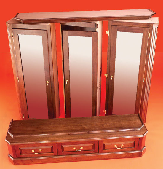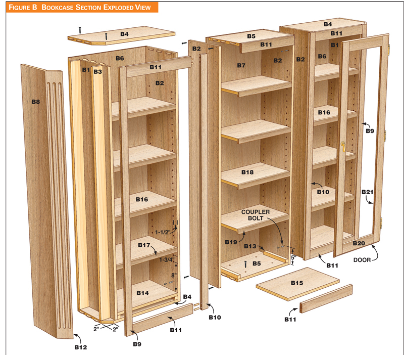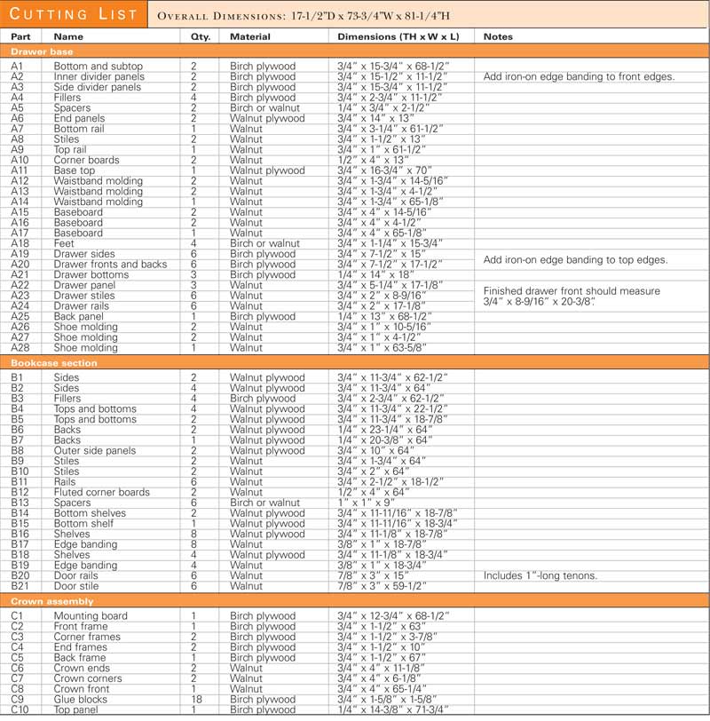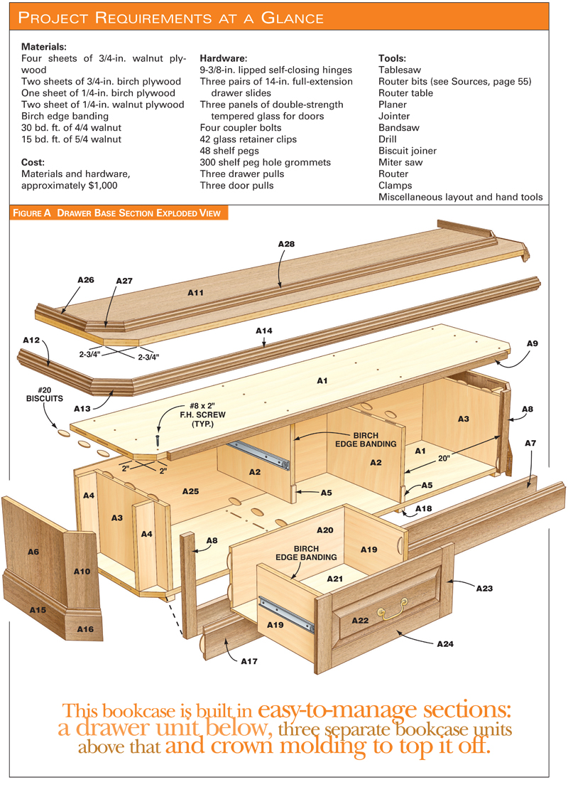 | Sometimes a new piece of furniture conjures up images from a distant time and place. This bookcase, I imagine, would fit right into an early 20th-century lawyer’s office, filled with leather-bound volumes and smelling of cigars. Rich walnut and generous moldings give it a luxurious feel, and hidden compartments are perfect for top-secret documents. The glass doors are as practical today for keeping dust off your books as they were 100 years ago. I’ve designed this bookcase for a thoroughly modern cabinetmaker, however. Its plywood cases are built with biscuits, the drawers use full-extension ball-bearing slides and the lipped doors are hung with easy-to-install wrap-around hinges. To make this large project more manageable, I built it in sections: a drawer unit below, three separate bookcase units above and a crown molding unit on top. The modular design also makes it easy to move it around your shop and into your house.A big project like this does require a bit of experience. You’ll need to know how to use a biscuit joiner, be well-versed in using a router and router table and know how to install drawer slides. The only advanced technique you may need to know is how to make and install the custom crown molding. If you make the bookcase in oak or birch, you could buy commercial crown molding, but if you choose walnut or cherry, you’ll probably want to make the molding yourself. One approach is covered in “Crown Molding on the Tablesaw” article. |