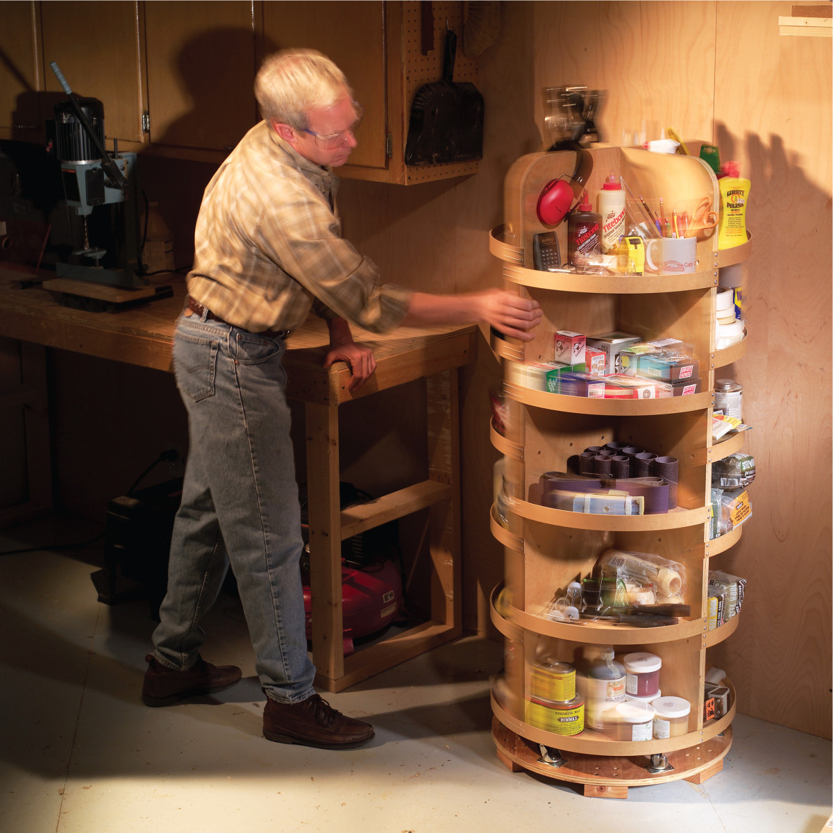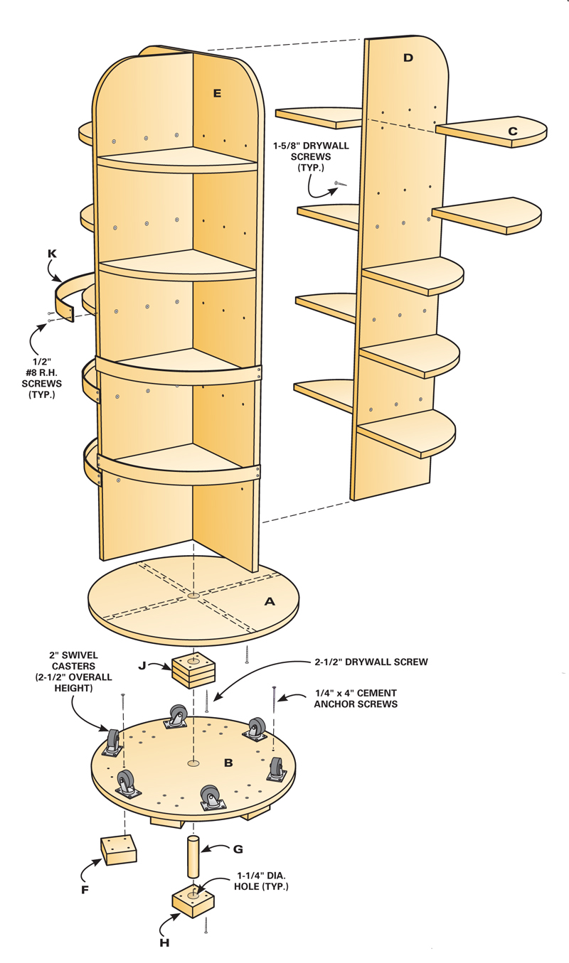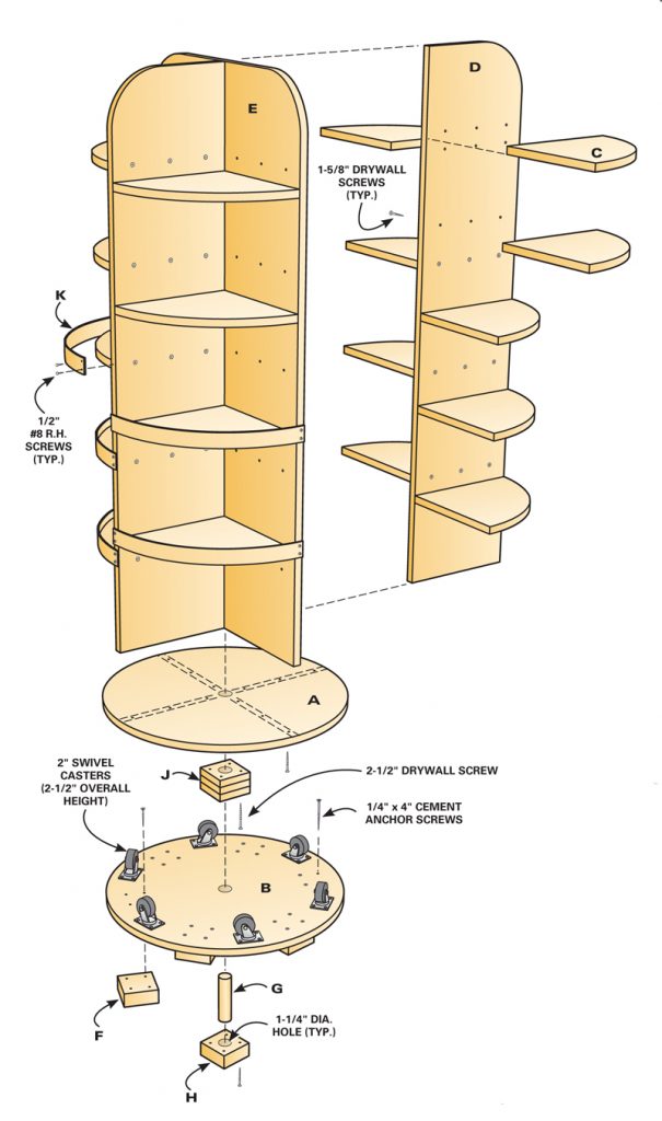 While visiting an antique shop, I discovered a way to store all that indispensable small stuff that used to clutter my workshop. On display was a rotating bolt cabinet from an old-fashioned hardware store. When I got home, I designed this carousel that rotates on inverted swivel casters. It’s easy to build, because there’s no complicated joinery. All the parts are cut to size and assembled with glue and screws.