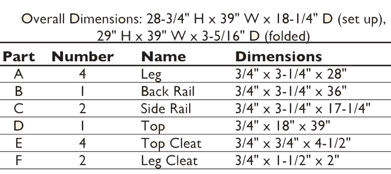 8. Turn the table upside down, swing the legs wide open (so they bear against the back rail) and fasten the cleats (E and F).