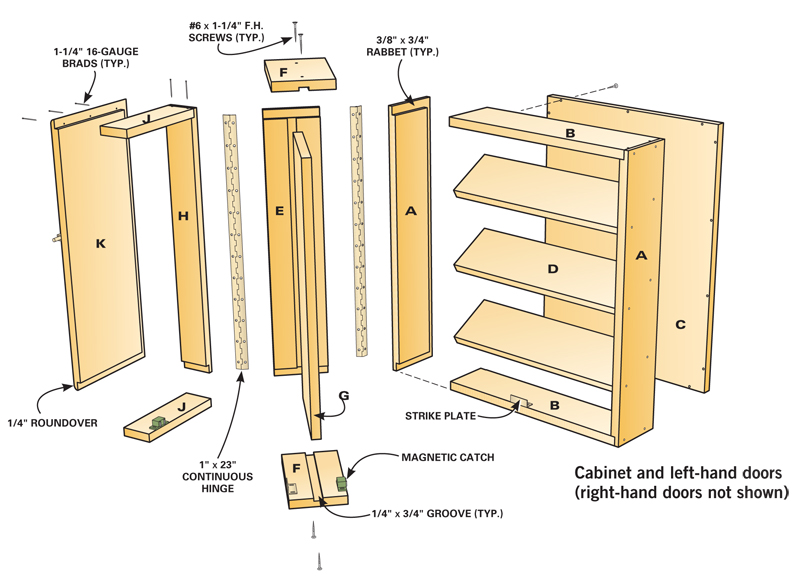 Inspired by the pantry cabinet in the kitchen of our new house, I built this compact version for my workshop. It has the same deep double-hinged doors that make everything inside easy to reach. I used 3/4-in.-thick stock so I could use screws to hang tools inside. The thick back made it easy to fasten the cabinet to the wall.