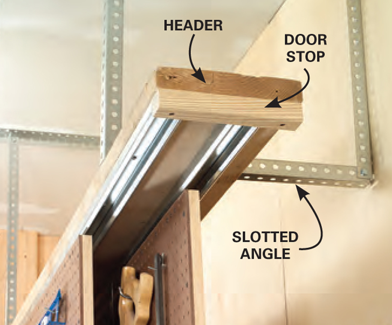 I mounted the sliding-door tracks on a 2×10 header that I anchored directly above the wide shelf with lengths of slotted angle extending from both the ceiling and wall.