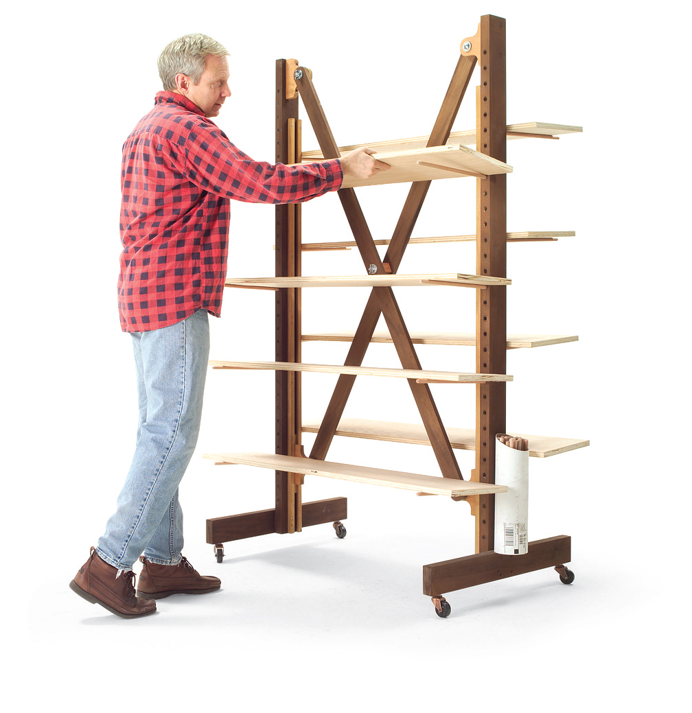 When I worked on a big project, every surface in my shop used to get covered with stacks of parts. While visiting a small production shop, I saw an expanding metal rack in the finish room, loaded with kitchen cabinet doors.