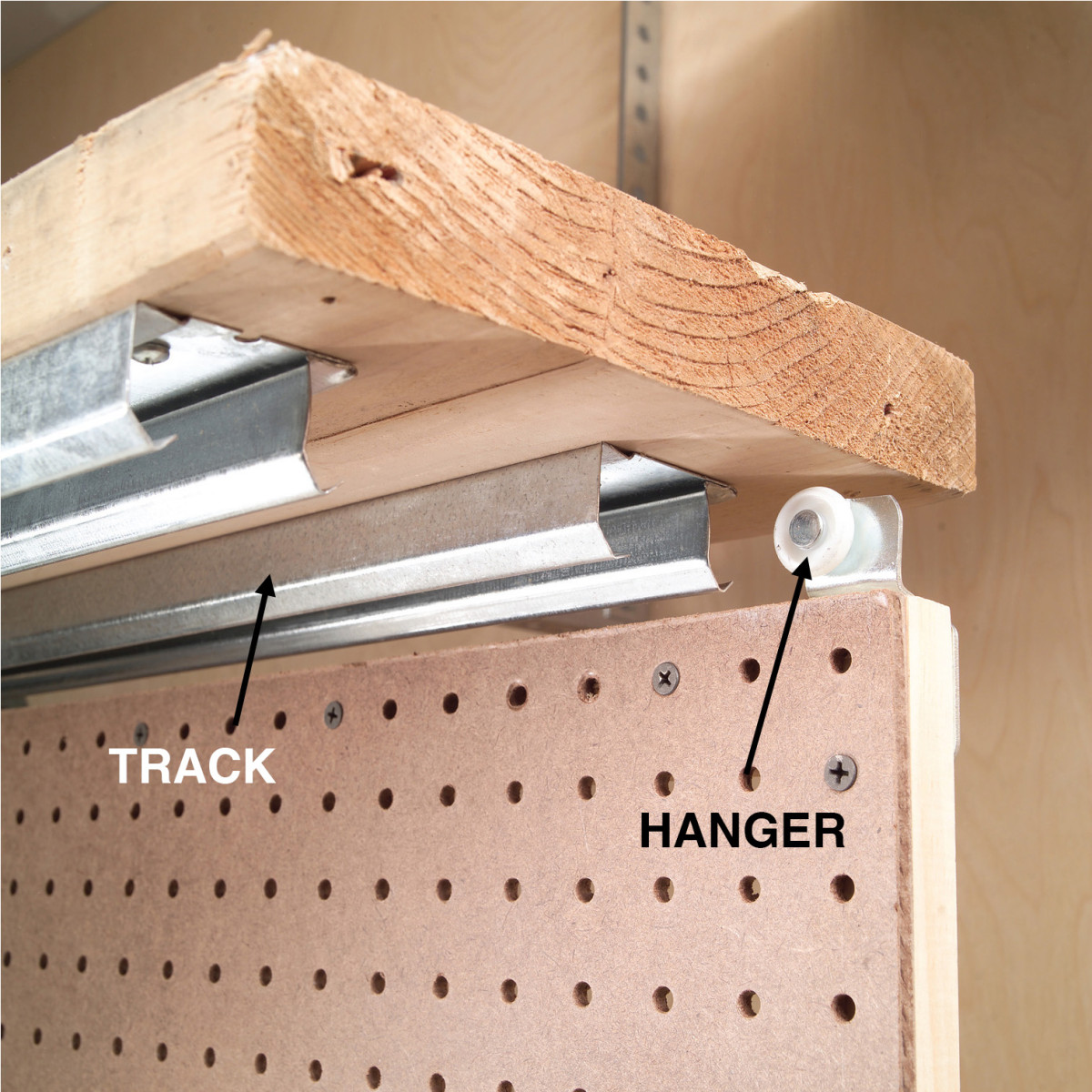The key was to mount the pegboard doors at least 5 in. apart, so I could load the back door with tools and still have it pass behind the front door. I bought two 96-in. Overhead Bypass Door Sets so each door could slide on its own track. Each kit contains a single length of track designed to hold both doors, two pairs of door hangers and a tracking guide designed to keep both doors in line at the floor.