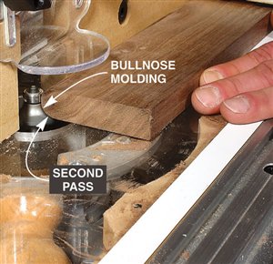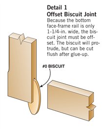 1. Plane your parts to final thickness after you’ve rough cut them to width and length. It doesn’t take long because there are only about two dozen parts. 2. Cut rabbets along the inside edge of the cabinet sides with a dado blade. The cabinet back fits into this rabbet. 3. Drill shelf-pin holes before assembling the case, using a template and 5mm self-centering drill bit. The template guarantees evenly spaced holes and the self-centering bit has a built-in stop to keep you from drilling through the side. 4. Cut biscuit joints in the face frames. Using this simple jig allows you to safely and quickly cut accurate slots in the thin, narrow parts. The bottom face-frame rail is too narrow to hold a whole biscuit so the slot is offset. The biscuit will protrude but can be trimmed after the gluing and will be hidden by the bullnose cabinet bottom. 5. Clamp and glue the face frame to the case. The face frame is 1/16-in. wider than the case to allow some wiggle room during glue up in the event that the case or face frame are a little out of square. 6. Rout a bullnose profile for the decorative top and bottom moldings with a round-over bit. First rout one side, flip the wood over and rout again. Presto, a bullnose! Oops! |