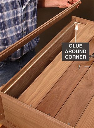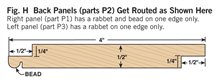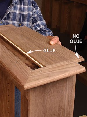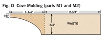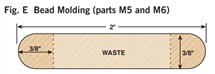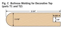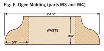 2. Cut all the parts to rough size by adding 1/2 in. to the final length and width (see Cutting List, below) and plane the parts to their final thickness (Photo 1). 3. Next, rabbet the case sides (C1) with a dado blade in your tablesaw (Photo 2). Two passes are needed to make the 1-in.-wide by 3/8-in.-deep dado on the back inside edge of each side. 4. Now cut the case sides, the top and the bottom (C2) to final width and length. 5. Drill the shelf-pin holes next (Photo 3) using a drilling template (Fig. A) and a 5mm self-centering drill bit (see Sources, page 101). It’s a lot easier to do this now because there’s not a lot of room inside the finished cabinet. 6. You can now join the top and bottom to the case sides. Two #20-size biscuits will fit neatly in the panels (Fig. B). Glue up the case, carefully checking the diagonal measurements to guarantee squareness. Note that the case bottom is set 1/2-in. up from the bottom ends of the case sides (Fig. B). This way the case bottom and the bottom face-frame rail will be flush on the inside of the cabinet. 7. Make the face frame next. It’s difficult to cut accurate biscuit joints in 1/2-in.-thick material (see Oops!, below), so we built a simple clamping jig with toggle clamps for better results (Photo 4). This jig makes it easy to cut the partial biscuit joint (Detail 1) for the bottom face-frame rail (F3), which is only 1-1/4-in. wide. To cut the biscuit slots in the stiles (F1), modify your first jig, or make a second jig to hold the stiles parallel rather than perpendicular to your biscuit joiner. Glue up the face frame, making sure it is square. When dry, trim the protruding biscuits at the bottom and glue the face frame to the case (Photo 5). The total width for the face frames is 1/16-in. wider than the overall case dimension. This allows for some wiggle room when gluing the face frame to the case in the event the face frame or case are not perfectly square. The face frame is easily cleaned up with a hand plane, hand scraper, or a flush-trim bit in a router. 8. Next, rout the stopped chamfer along the edge of the face frame (Fig. B). Add the Decorative Top and BottomThe top and bottom bullnose moldings (T1, T2, B1 and B2) are made using two round-over router bits (Photo 6). For the top bullnose moldings, use a 5/16-in. round-over bit. For the bottom moldings, use a 1/4-in. round-over bit. The bullnoses will have a slightly flat spot in the center but a little sanding makes them perfect. Cut the 1/4-in. groove (Figs. C and G) in the bullnose parts with a dado blade in your tablesaw. Finally, miter these parts and cut to final length; then biscuit and glue them together (Photo 7). A stepped clamping block is used to clamp this molding together to make a three-sided frame. The frame is then screwed to the case top (Fig. A). The screw heads are hidden with wood plugs. Next, make the top and bottom panels (T3 and B3) that fit into the grooves of the bullnose trim. To create the 1/4-in.-thick by 3/8-in.-wide tongue on three sides of these parts (Fig. A), use a rabbeting router bit or your dado blade. The panels are 1/16-in. undersized in length to make them easy to slide in. Gluing just the front edge allows the solid-wood panels to move in their frames with seasonal humidity changes (Photo 8). Make the MoldingsFor this cove molding (M1 and M2), set the auxiliary fence at 30 degrees to the blade (Photo 9). A bit of practice is in order here, so start with a scrap 4-in.-wide board for a test run. The wider blank will keep your fingers away from the blade and is less likely to tip toward the blade. Raise the blade in small increments for each cut until you reach the desired depth. When you’ve mastered a practice piece you’re ready for the real thing. After forming the cove, cut the molding to final width (Fig. D). Hand sand or use a curved scraper to remove the saw marks from the inside of the cove. The ogee molding (M3 and M4) is next. Rout the profile with the ogee bit on both sides of a 2-1/2-in. board (Fig. F), then rip the board on the tablesaw to create two separate moldings (Photo 10). One 25-in.-long board will yield moldings for all three sides. The bead molding (Fig. E, M5 and M6) is made with two passes of a 3/16-in. round-over bit in your router table. Also, just like the ogee, rout both sides of a wider board for safety and ease of routing. Using a pneumatic pin nailer makes quick work of applying molding (Photo 11). If you hand nail, it’s a good idea to drill small pilot holes to prevent the wood from splitting. These small holes are easily filled and hidden with a little putty or a wax pencil. Custom Fit the ShelvesMark the shelf notches directly from the case (Photo 12). In theory, this notch should be 3/4-in. long by 1/4-in. wide, but if your face frame was glued slightly to one side, there will be minor differences in the sizes of the notches from one side of the shelves to the other. Measuring directly from the case will give a custom fit and avoid errors that can occur when making inside measurements with a tape measure or from assuming both sides are the same. Traditional Shiplapped BackRout the beaded shiplapped back panels (Figs. B and H) for your cabinet with a beading bit (Photo 13). The interlocking rabbets allow for expansion and the screws at the top and bottom of each section hold the panels securely in place (Fig. B). Back panels P1 and P3 fit into the rabbets along the case sides. Gluing along these case sides and just around the corners provides additional strength and stability to the case (Photo 14). Simple and Classic FinishTo make finishing easier, remove the three center back panels (P2) that are just attached with screws. We sanded our cabinet to 220 grit and applied a walnut stain to even out minor color variations in the walnut. Then we applied a wiping oil finish to give the case a soft glow. An oil finish does not provide much protection against moisture, so if you plan to use your cabinet