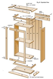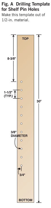 Woodcraft Supply, woodcraft.com, 800-225-1153, 1/4″ R x 1-1/2″ D Ogee Bit, #812290, $41; Vertical Handle Toggle Clamp, #143934, $13.50 ea.; Home Center/Hardware Store Minwax Special Walnut Stain, #224, $10 per Cutting ListFig. A: Drilling Template for Shelf Pin HolesDetail 1: Offset Biscuit JointExploded View |