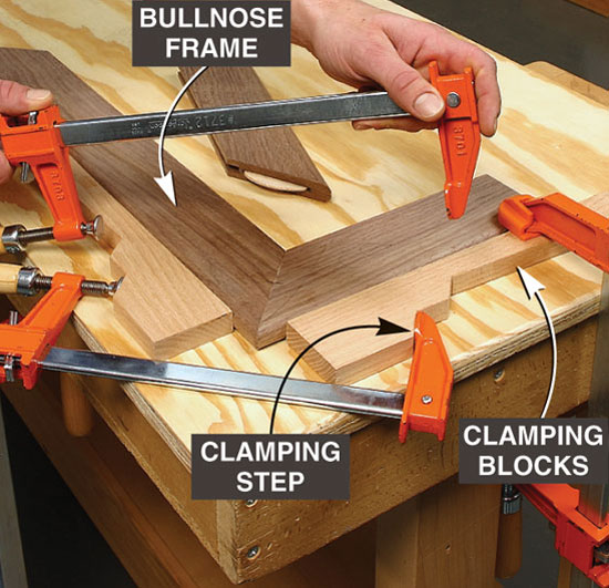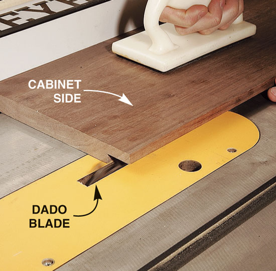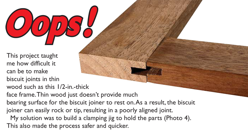 1. Plane your parts to final thickness after you’ve rough cut them to width and length. It doesn’t take long because there are only about two dozen parts. 2. Cut rabbets along the inside edge of the cabinet sides with a dado blade. The cabinet back fits into this rabbet. 3. Drill shelf-pin holes before assembling the case, using a template and 5mm self-centering drill bit. The template guarantees evenly spaced holes and the self-centering bit has a built-in stop to keep you from drilling through the side. 4. Cut biscuit joints in the face frames. Using this simple jig allows you to safely and quickly cut accurate slots in the thin, narrow parts. The bottom face-frame rail is too narrow to hold a whole biscuit so the slot is offset. The biscuit will protrude but can be trimmed after the gluing and will be hidden by the bullnose cabinet bottom. 5. Clamp and glue the face frame to the case. The face frame is 1/16-in. wider than the case to allow some wiggle room during glue up in the event that the case or face frame are a little out of square. 6. Rout a bullnose profile for the decorative top and bottom moldings with a round-over bit. First rout one side, flip the wood over and rout again. Presto, a bullnose! Oops! |