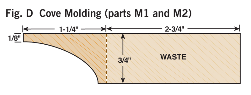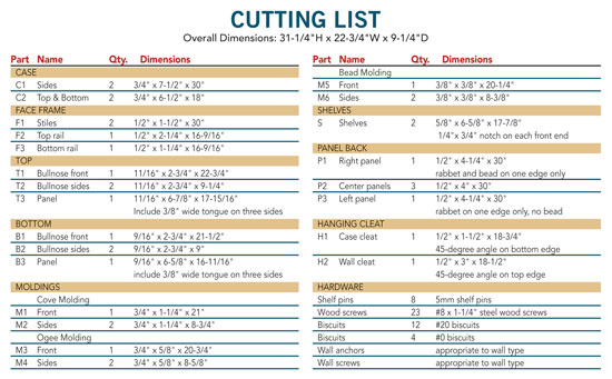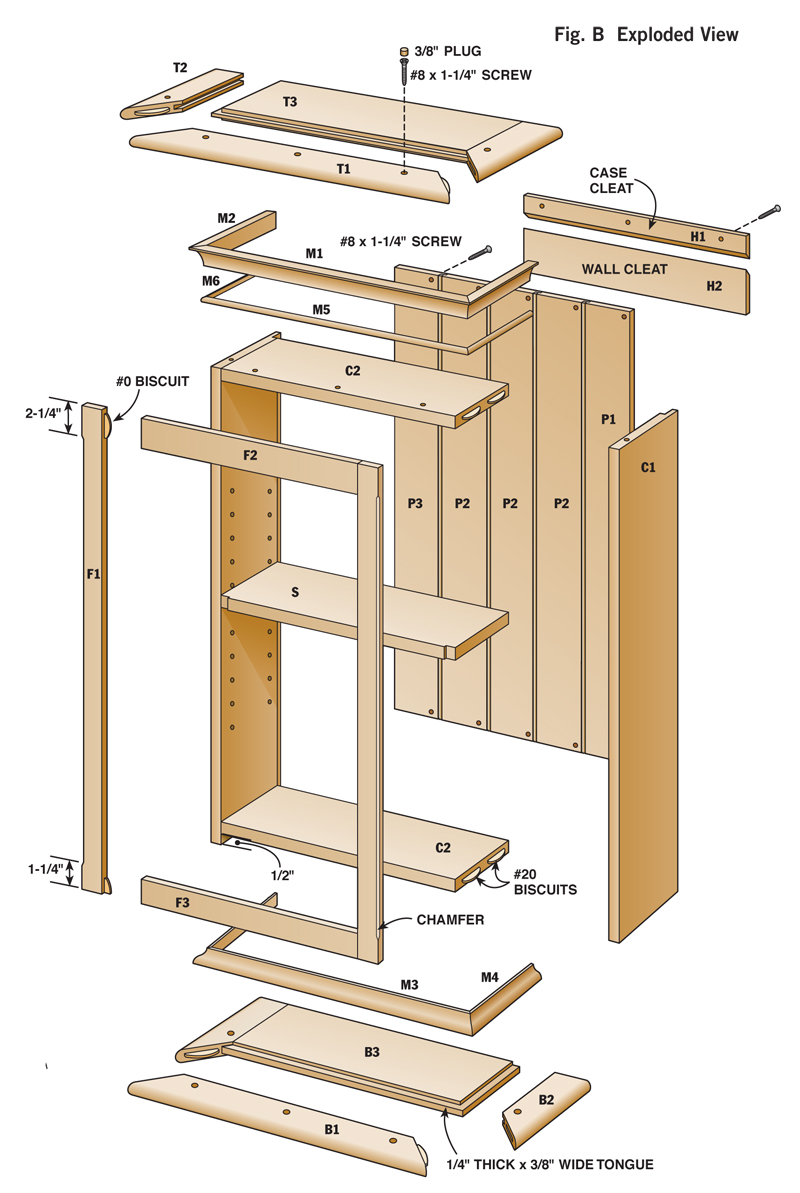 Details Made EasyWe’ve packed a ton of great details into this cabinet, and some great techniques into this story. We’ll show you how to cut cove molding on your tablesaw and how a special beading bit makes quick work of the shiplapped back. Your router and router table can handle all the other moldings. All the parts for this cabinet are made from 3/4-in.-thick lumber, which keeps the materials list simple. An intermediate-level woodworker can plan on two or three weekends to complete this cabinet. And when you’re done, a hidden cleat easily and invisibly secures the case to the wall. Small Changes Make a Big DifferenceIn a small case, changing dimensions by even a fraction can make a world of difference in the final appearance. The top of this case is 11/16-in. thick and overhangs the side by 1/4-in. more at the sides than the front. The bottom is 9/16-in. thick, the shelves are 5/8-in. thick and the face frames are 1/2-in. thick. These carefully chosen dimensions give this cabinet a comfortable and balanced look. Traditional Design, Modern ToolsYou’ll need a surface planer, jointer, router, router table, tablesaw, dado blade and biscuit joiner for the construction. To make the moldings, seven router bits are needed, three round-over bits, a beading bit, a chamfer bit, an ogee bit and a rabbeting bit. You may have several of these already, but if you buy all the bits new, the cost will be approximately $170 (see Sources, below). We used 25 bd. ft. of 4/4 rough walnut for our cabinet at a cost of $125 (see Sources). Build the Cabinet in Stages1. Begin by selecting the wood for each part (the sides require the widest boards). Straight-grained wood looks best for face frames. Match the face-frame stiles to the case sides and they’ll look like one piece when assembled.