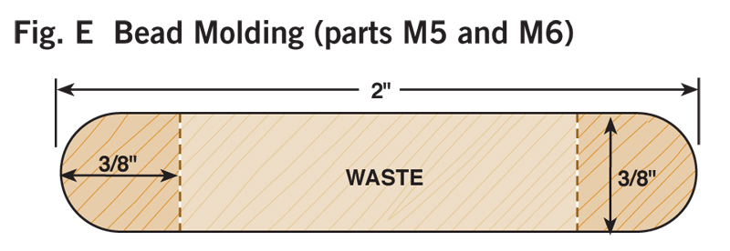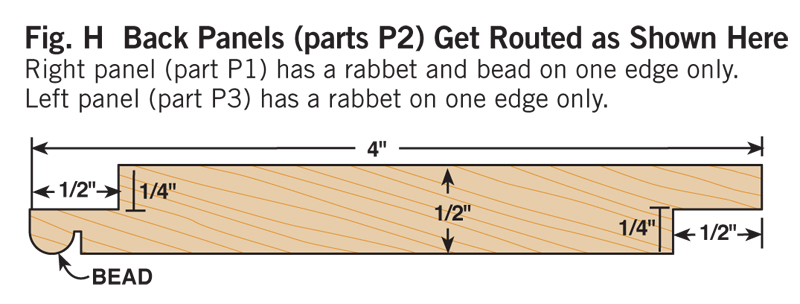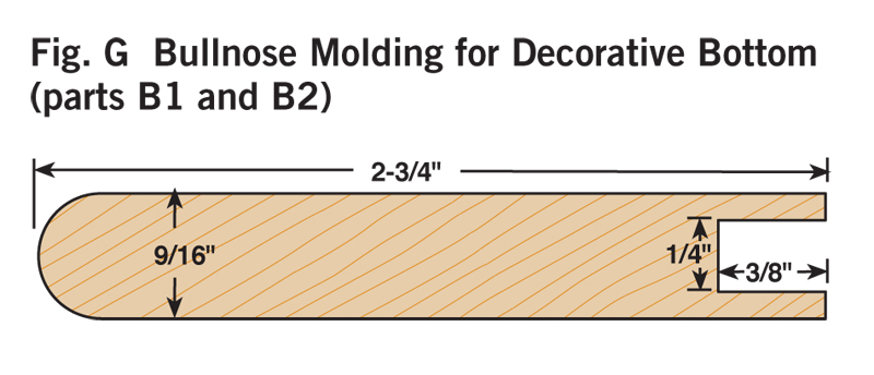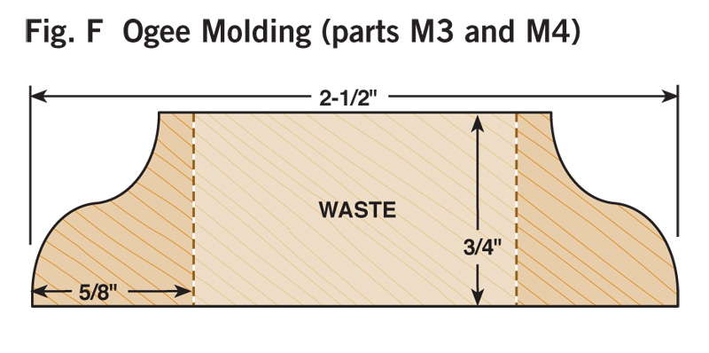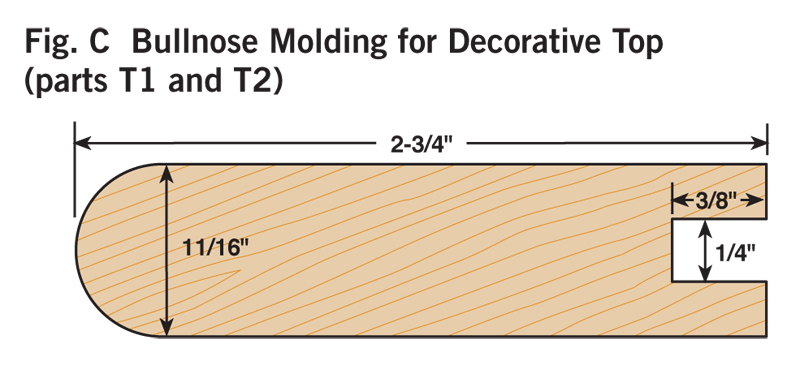 2. Cut all the parts to rough size by adding 1/2 in. to the final length and width (see Cutting List, below) and plane the parts to their final thickness (Photo 1). 3. Next, rabbet the case sides (C1) with a dado blade in your tablesaw (Photo 2). Two passes are needed to make the 1-in.-wide by 3/8-in.-deep dado on the back inside edge of each side. 4. Now cut the case sides, the top and the bottom (C2) to final width and length. 5. Drill the shelf-pin holes next (Photo 3) using a drilling template (Fig. A) and a 5mm self-centering drill bit (see Sources, page 101). It’s a lot easier to do this now because there’s not a lot of room inside the finished cabinet. 6. You can now join the top and bottom to the case sides. Two #20-size biscuits will fit neatly in the panels (Fig. B). Glue up the case, carefully checking the diagonal measurements to guarantee squareness. Note that the case bottom is set 1/2-in. up from the bottom ends of the case sides (Fig. B). This way the case bottom and the bottom face-frame rail will be flush on the inside of the cabinet. 7. Make the face frame next. It’s difficult to cut accurate biscuit joints in 1/2-in.-thick material (see Oops!, below), so we built a simple clamping jig with toggle clamps for better results (Photo 4). This jig makes it easy to cut the partial biscuit joint (Detail 1) for the bottom face-frame rail (F3), which is only 1-1/4-in. wide. To cut the biscuit slots in the stiles (F1), modify your first jig, or make a second jig to hold the stiles parallel rather than perpendicular to your biscuit joiner. Glue up the face frame, making sure it is square. When dry, trim the protruding biscuits at the bottom and glue the face frame to the case (Photo 5). The total width for the face frames is 1/16-in. wider than the overall case dimension. This allows for some wiggle room when gluing the face frame to the case in the event the face frame or case are not perfectly square. The face frame is easily cleaned up with a hand plane, hand scraper, or a flush-trim bit in a router. 8. Next, rout the stopped chamfer along the edge of the face frame (Fig. B). Add the Decorative Top and BottomThe top and bottom bullnose moldings (T1, T2, B1 and B2) are made using two round-over router bits (Photo 6). For the top bullnose moldings, use a 5/16-in. round-over bit. For the bottom moldings, use a 1/4-in. round-over bit. The bullnoses will have a slightly flat spot in the center but a little sanding makes them perfect. Cut the 1/4-in. groove (Figs. C and G) in the bullnose parts with a dado blade in your tablesaw. Finally, miter these parts and cut to final length; then biscuit and glue them together (Photo 7). A stepped clamping block is used to clamp this molding together to make a three-sided frame. The frame is then screwed to the case top (Fig. A). The screw heads are hidden with wood plugs. Next, make the top and bottom panels (T3 and B3) that fit into the grooves of the bullnose trim. To create the 1/4-in.-thick by 3/8-in.-wide tongue on three sides of these parts (Fig. A), use a rabbeting router bit or your dado blade. The panels are 1/16-in. undersized in length to make them easy to slide in. Gluing just the front edge allows the solid-wood panels to move in their frames with seasonal humidity changes (Photo 8). Make the MoldingsFor this cove molding (M1 and M2), set the auxiliary fence at 30 degrees to the blade (Photo 9). A bit of practice is in order here, so start with a scrap 4-in.-wide board for a test run. The wider blank will keep your fingers away from the blade and is less likely to tip toward the blade. Raise the blade in small increments for each cut until you reach the desired depth. When you’ve mastered a practice piece you’re ready for the real thing. After forming the cove, cut the molding to final width (Fig. D). Hand sand or use a curved scraper to remove the saw marks from the inside of the cove. The ogee molding (M3 and M4) is next. Rout the profile with the ogee bit on both sides of a 2-1/2-in. board (Fig. F), then rip the board on the tablesaw to create two separate moldings (Photo 10). One 25-in.-long board will yield moldings for all three sides. The bead molding (Fig. E, M5 and M6) is made with two passes of a 3/16-in. round-over bit in your router table. Also, just like the ogee, rout both sides of a wider board for safety and ease of routing. Using a pneumatic pin nailer makes quick work of applying molding (Photo 11). If you hand nail, it’s a good idea to drill small pilot holes to prevent the wood from splitting. These small holes are easily filled and hidden with a little putty or a wax pencil. Custom Fit the ShelvesMark the shelf notches directly from the case (Photo 12). In theory, this notch should be 3/4-in. long by 1/4-in. wide, but if your face frame was glued slightly to one side, there will be minor differences in the sizes of the notches from one side of the shelves to the other. Measuring directly from the case will give a custom fit and avoid errors that can occur when making inside measurements with a tape measure or from assuming both sides are the same. Traditional Shiplapped BackRout the beaded shiplapped back panels (Figs. B and H) for your cabinet with a beading bit (Photo 13). The interlocking rabbets allow for expansion and the screws at the top and bottom of each section hold the panels securely in place (Fig. B). Back panels P1 and P3 fit into the rabbets along the case sides. Gluing along these case sides and just around the corners provides additional strength and stability to the case (Photo 14). Simple and Classic FinishTo make finishing easier, remove the three center back panels (P2) that are just attached with screws. We sanded our cabinet to 220 grit and applied a walnut stain to even out minor color variations in the walnut. Then we applied a wiping oil finish to give the case a soft glow. An oil finish does not provide much protection against moisture, so if you plan to use your cabinet