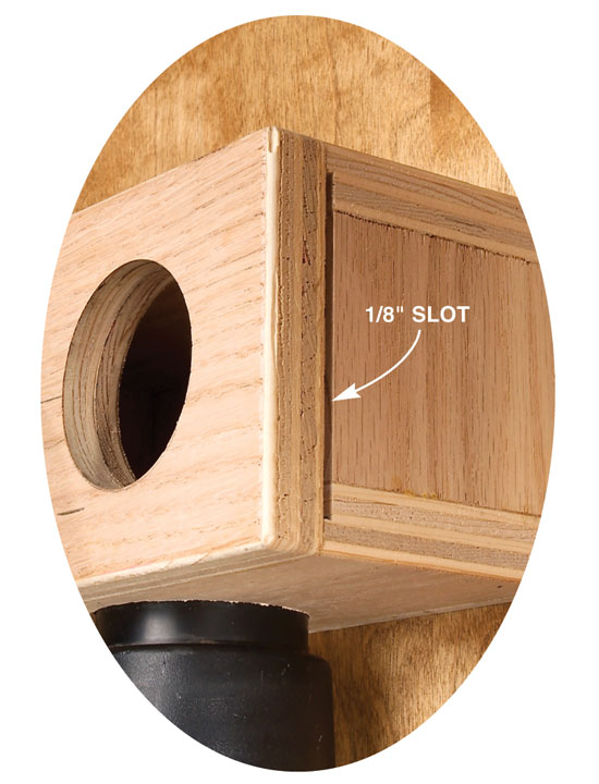To make the box, I drilled holes for the hoses and rabbeted the box sides for the 1/8-in. blast gates. After cutting the end pieces to match the rabbets, I glued the box together on a long backplate for wall-mounting. I made blast gates from scraps of plastic, but hardboard would work just as well. To make the wooden handles, I sawed a kerf in an oversize blank, cut the handles from the blank and drilled holes for the screws.