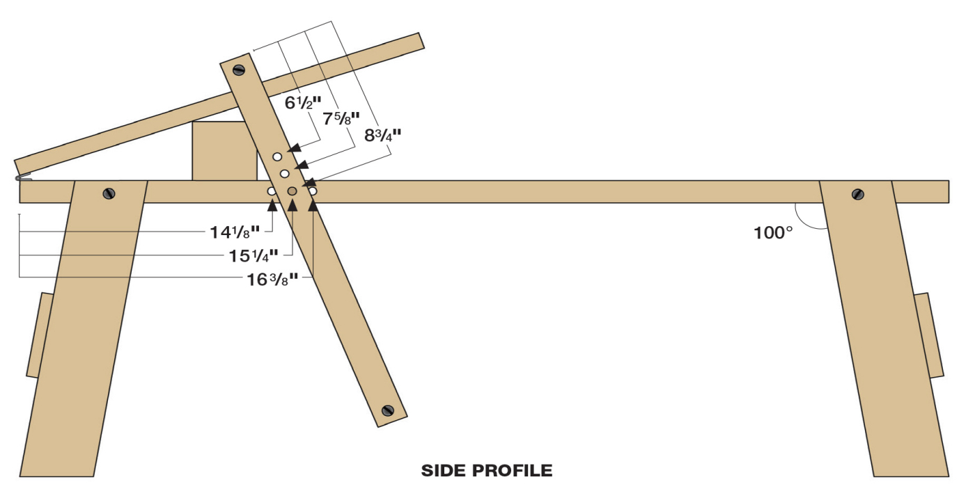 7. I use a simple jig to drill the three pivot pin holes along the sides of the bench board. The jig is just a scrap of hardwood and a piece of plywood to guide the drill straight into the center of the bench board.
