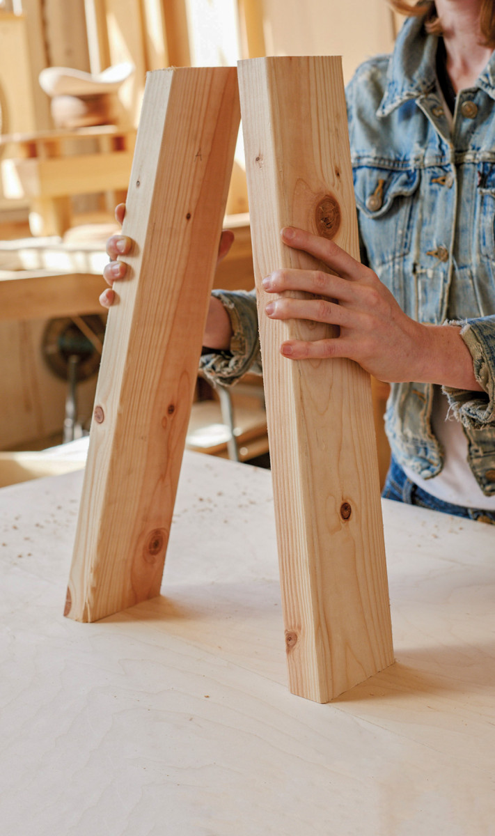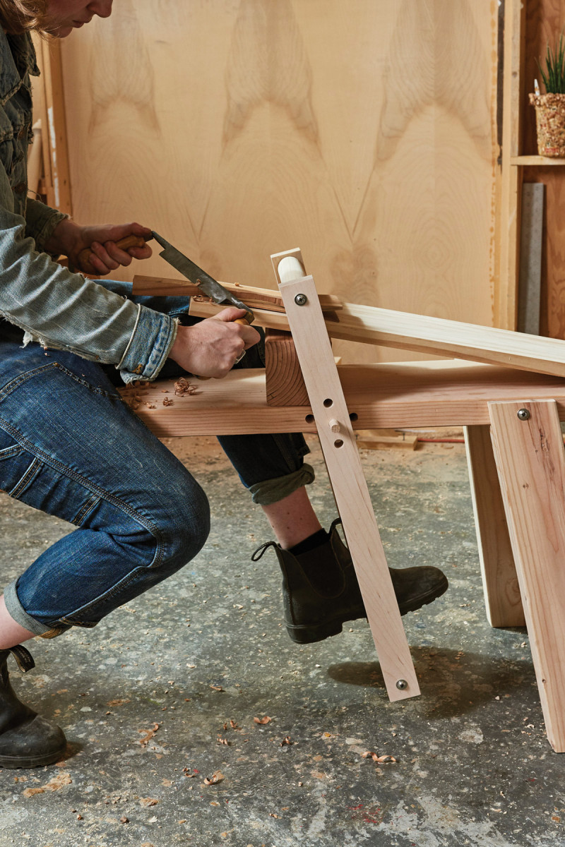 1. The legs should end up parallel with the top of the seat and splayed forward (or back). It’s good to double- check this on the bench. Once those cuts are made, mark the two pairs of legs.